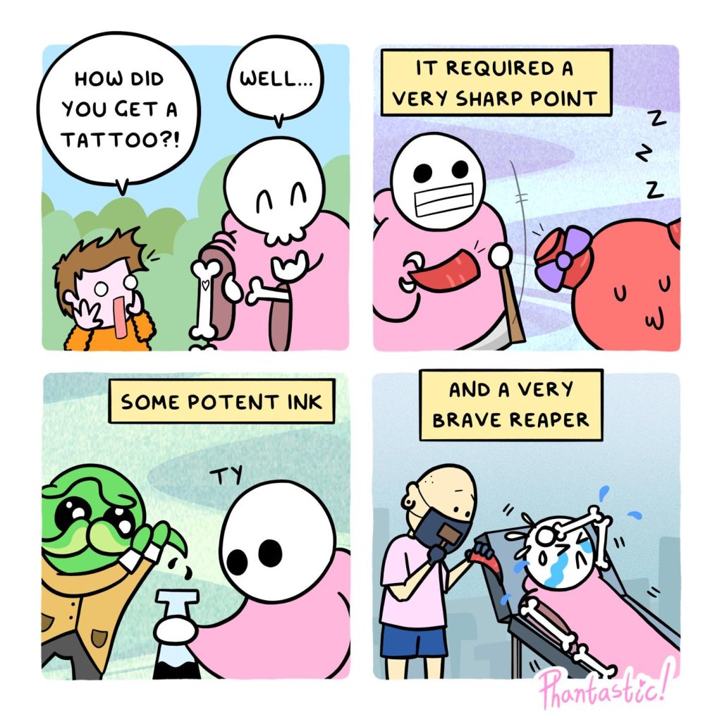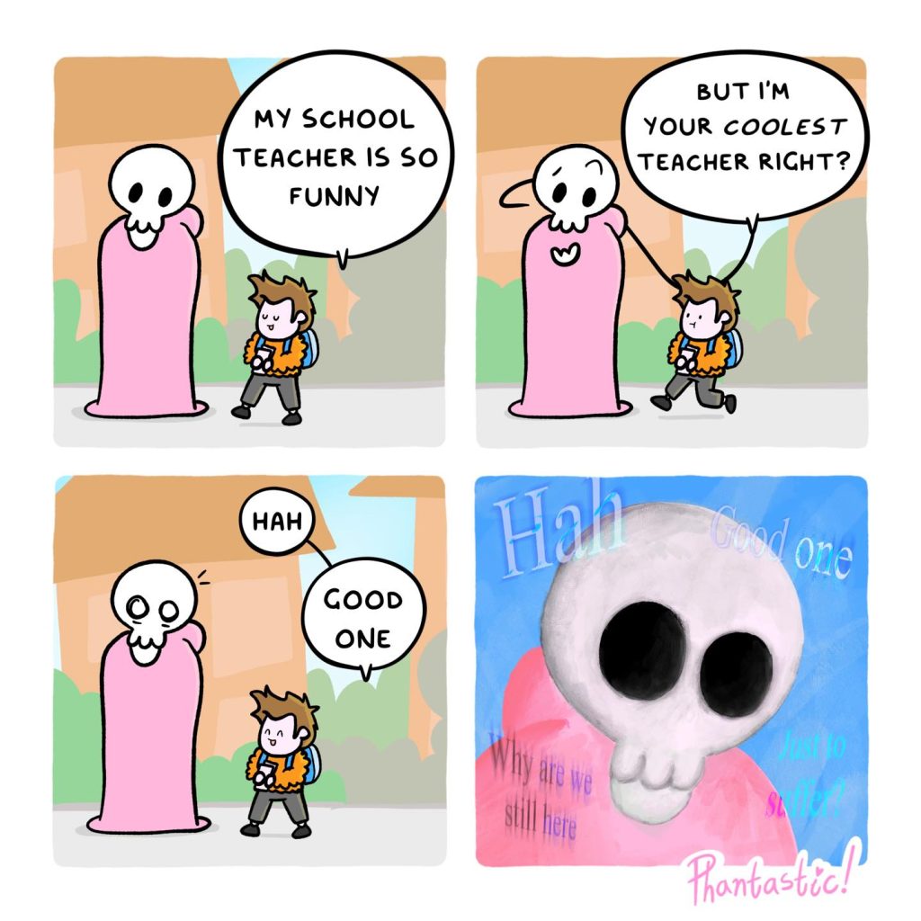 The artist’s jokes revolve around a thing that all human beings are afraid of, death. The artist’s comics portray the funny and dark journey of a kid and death. This child, who might represent innocence or curiosity, goes on various adventures with death by their side. Through these adventures, the artist reveals the funny side of life’s most serious moments, showing how even in the face of death, there can be humor and lightness. The relationship between the child and death is at the heart of the comics.